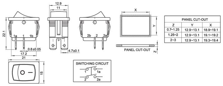 15*21 船型開關 蹺板開關 IO電源開關 1.額定工作電壓、電流Rating 3A/6A/15A 250V 2.使用溫度范圍Temperature -25+85℃ 3.接觸電阻Contact Resistance <0.03Ω 4.動作力Actuating Force 1.3+0.5N 5.絕緣電阻Insulation Resistance >100MΩ 6.壽命(switching Life) 10000次