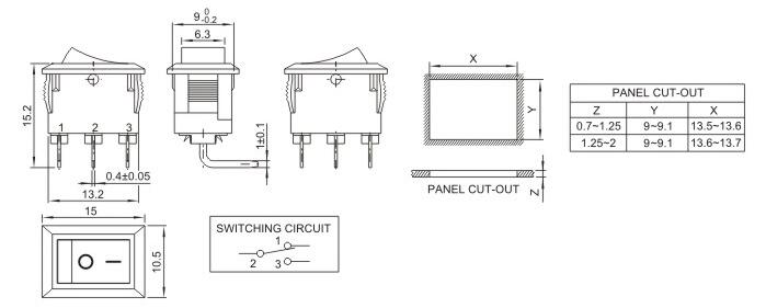 10*15 船型開關 蹺板開關 IO電源開關 1.額定工作電壓、電流Rating 3A/6A/15A 250V 2.使用溫度范圍Temperature -25+85℃ 3.接觸電阻Contact Resistance <0.03Ω 4.動作力Actuating Force 1.3+0.5N 5.絕緣電阻Insulation Resistance >100MΩ 6.壽命(switching Life) 10000次