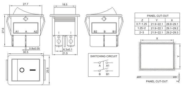 25*30.5 船型開關 蹺板開關 IO電源開關 1.額定工作電壓、電流Rating 3A/6A/15A 250V 2.使用溫度范圍Temperature -25+85℃ 3.接觸電阻Contact Resistance <0.03Ω 4.動作力Actuating Force 1.3+0.5N 5.絕緣電阻Insulation Resistance >100MΩ 6.壽命(switching Life) 10000次