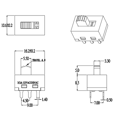 工作溫度范圍Operating temperature range:-30℃to+85℃   額定電流Rating:6A 250V AC   絕緣電阻Insulation resistance: 100MΩ min.500V DC 接觸電阻Contact resistance: 30m Ω max.   操作力度Operating fore:250±100gf   壽命Life time:10000 cycles(依產(chǎn)品而定)