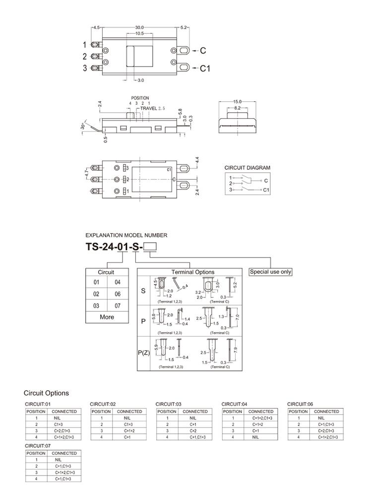 工作溫度范圍Operating temperature range:-30℃ to+85℃ 額定電流Rating:3A 250V AC 絕緣電阻Insulation resistance: 100MΩ min.500V DC 接觸電阻Contact resistance: 30m Ω max. 操作力度Operating fore:250±100gf 壽命Life time:10000 cycles(依產品而定)