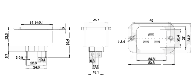 標準:IEC 60320 C20 額定功率:2.5A 250V AC 絕緣電阻:100MΩ 500V DC/1分鐘 絕緣強度:2000V AC/1分鐘 外殼材料:熱塑性塑料 94V-2~V-0