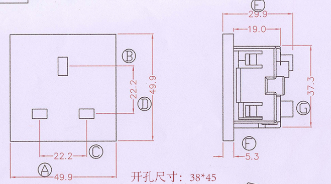 額定值:13A 250V AC 絕緣電阻:100MΩ500V DC / 1分鐘 介電強度:2000V AC / 1分鐘 外殼材料:熱塑性塑料94V-2〜V-0 Pancel切出:45X45毫米