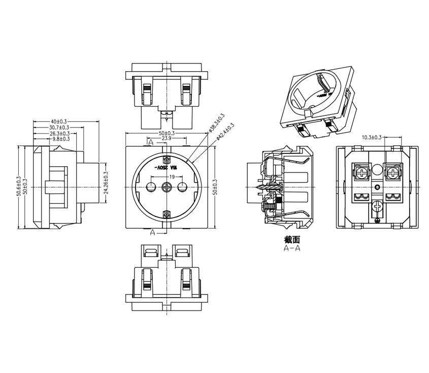 額定值:16A 250V AC 絕緣電阻:100MΩ500V DC / 1分鐘 介電強度:2000V AC / 1分鐘 外殼材料:熱塑性塑料94V-2〜V-0 Pancel切出:45X45毫米
