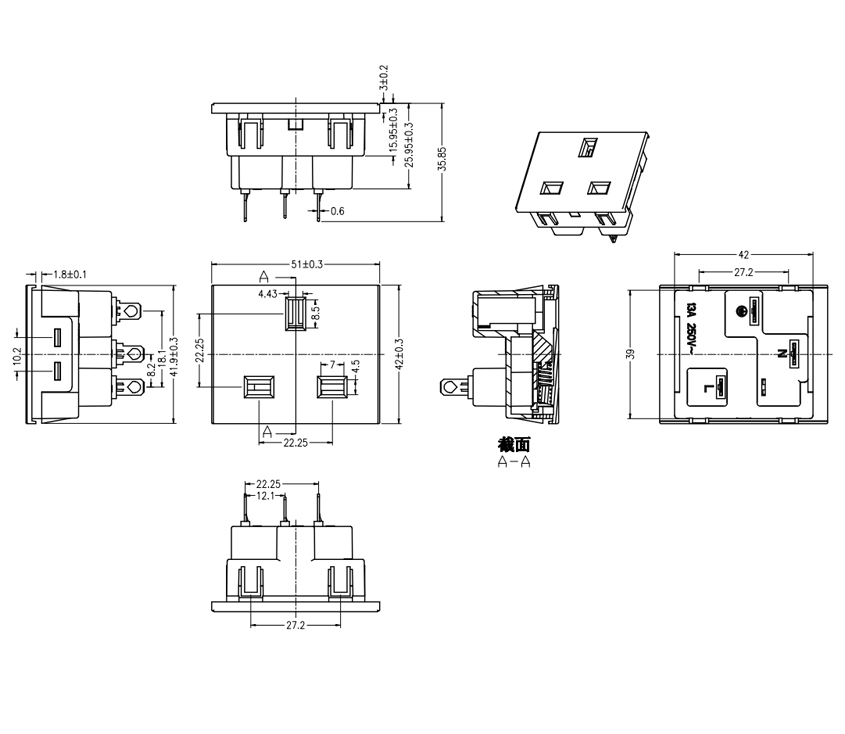 型 號(hào):L-BD-4A 卡入式英標(biāo) 用 途:桌面英規(guī)模塊、PDU機(jī)柜英規(guī)模塊、升降英標(biāo)模塊 尺 寸:51*42 功能:13A 250V