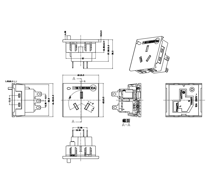 型 號:L-BD-5A 三孔國標卡入式 用 途:桌面國標模塊、PDU機柜國標模塊、升降國標模塊 尺 寸:51*42 功能:10A 250V